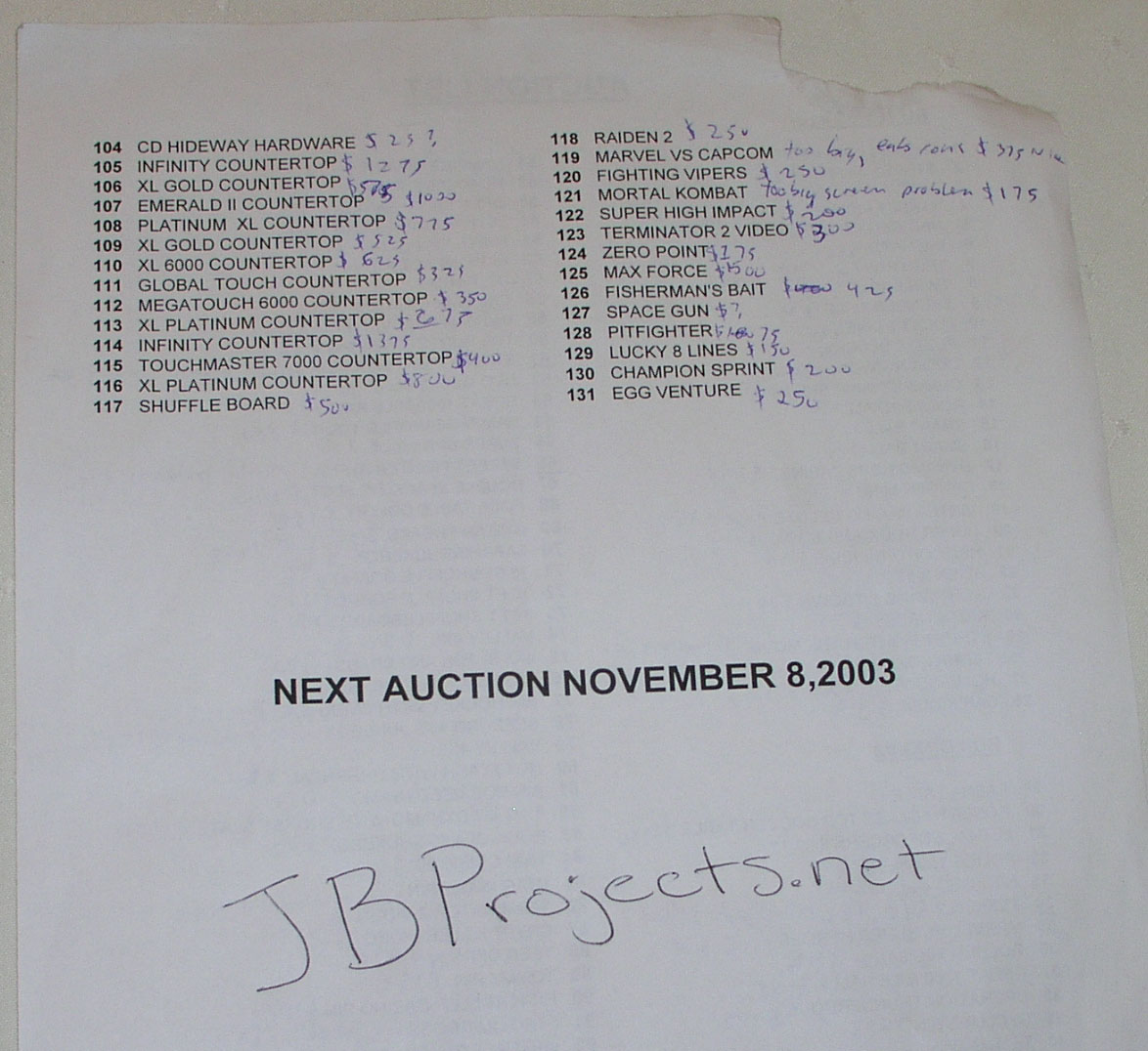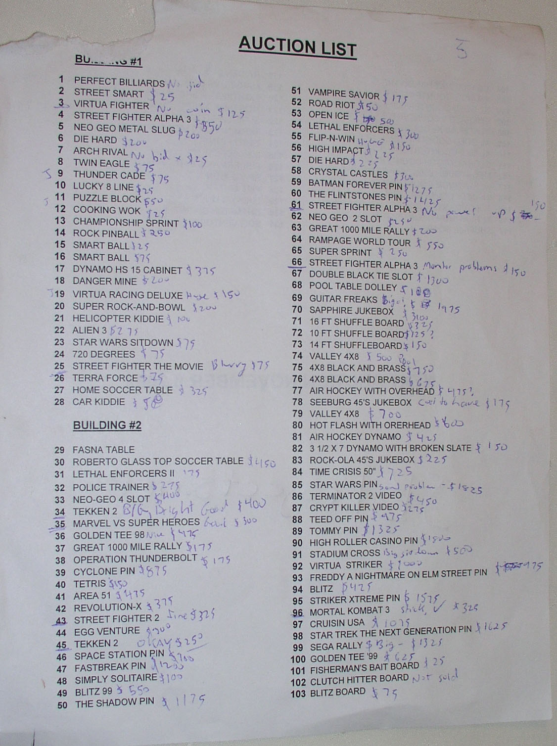 After you pay the $200 deposit, you pick up a sheet that has all of the machines listed by number. I wrote down the prices that each machine went for. At times it was difficult to hear the auctioner or to decifer which item was up for auction (the Starburst guy was a little slow on flipping the numbers some times). I believe I'm fairly accurate in my pricing but an error allowance of +/- $1000 should cover any mistakes I made =).