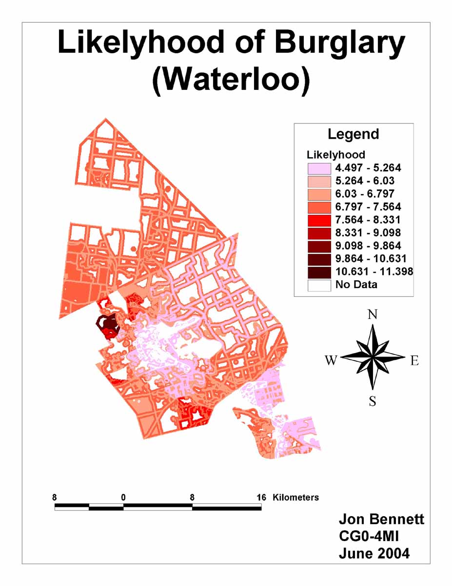 Based on the geographical information alone, the dark areas shown in my final map (Likelihood of Burglary (Waterloo)), are the most likely to be burglarized in Waterloo. The darkest area is also one of the richest in Waterloo. This means that the residents might employ additional policemen to patrol the area, and I'm sure that many have high-tech alarm systems. These are factors that were not considered in the study. Also numerous social factors were not considered, such as the ethnical composition of the neighborhood. So, this is not a complete study where all factors were taken into consideration.